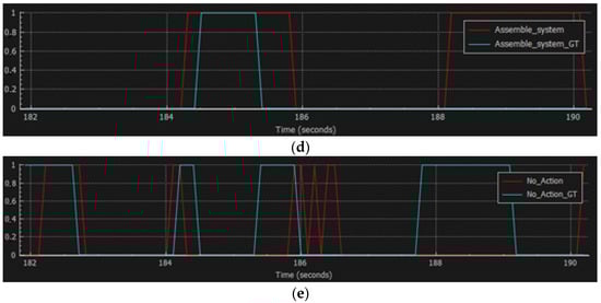 When evaluating the classes, such as the Assemble System and No Action (Figure 12d,e), noticeable model confusion can be observed. In this example, the ground truth of the No Action class in Figure 12e starts at the ~187.8th second and ends at the 189.2nd second. The Assemble System class overlaps with this time interval instead of the No Action class. Similar to the example shown in Figure 12a, false positives can be observed, together with the time shift of the detections. In this case, the time shift is more noticeable, as the detections do not provide the true positive detection.