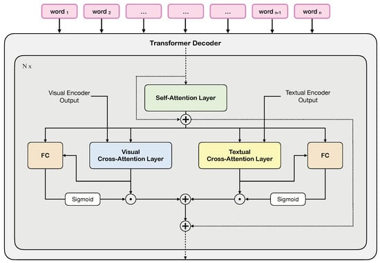 Given the input sequence of tokens, , the set of retrieved textual information, i.e., , as encoded by the textual encoder, and the set of visual features, i.e., , as encoded by the visual encoder, the operations performed by the decoder can be written as follows: