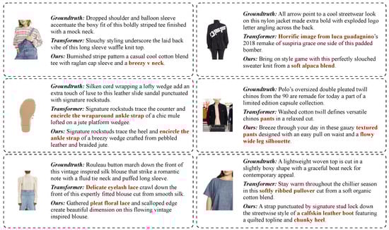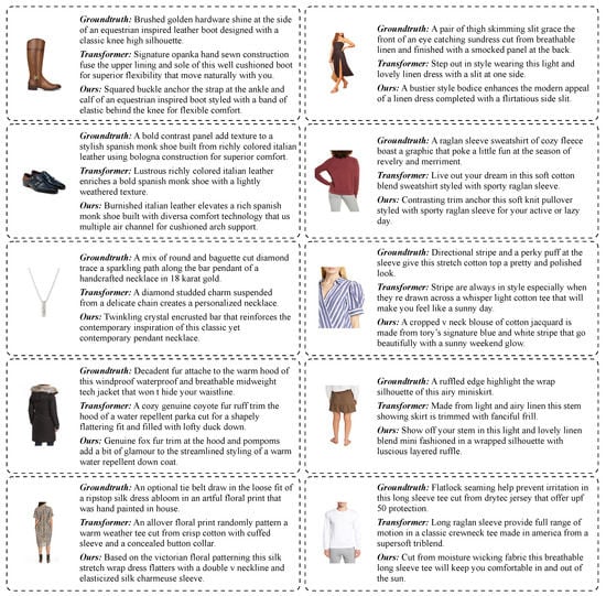 Thanks to the growth of e-commerce websites and the increasing importance of fashion and style in our daily lives, the computer vision community has focused on fashion-related research over the past few years. As a consequence, multi-modal tasks, such as text-to-image generation [] and cross-modal retrieval [,], have been extended and adapted to the fashion domain, resulting in virtual try-on approaches [,,,] and cross-modal retrieval methodologies of clothing items [,]. Image captioning, i.e., the task of generating natural language descriptions from visual inputs, streamlines and expedites the closed-captioning procedure for the creation and delivery of digital information and has, therefore, received significant interest from researchers []. On shopping websites, accurate and alluring descriptions of clothing could aid users in better understanding the features of clothing items and boost online sales by attracting more users.