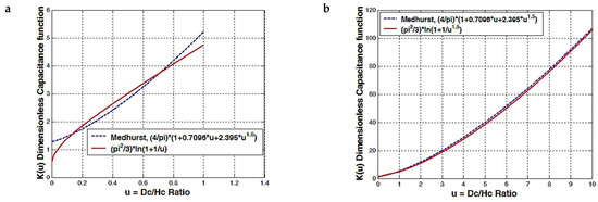 Coil capacitance dimensionless function (factor), comparison between the Medhurst formula and our theoretical logarithmic function; (a) 0 < u < 1, m = 1 and (b) u > 0, m = 1.5.