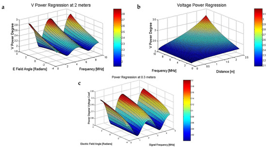 (a) Absolute power degree for voltage (+1 for the E field) function of the frequency spectrum (1–10 MHz) and an E field angle, in radians; (b) absolute power degree for voltage (+1 for the E electrical field) function of the frequency spectrum (1–10 MHz) and a transducer distance in m; (c) absolute power degree for voltage (+1 for the E field) at a fixed 0.3 m distance, function of the frequency spectrum (1–5 MHz) and an E field angle in radians.