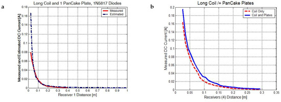 The current and voltage power regression variation with distance can be used to estimate the electrical and magnetic field amplitude. If we measure the distance with a laser or a precise mechanical system, we can choose different rectifying diodes: SB1100 voltage-sensitive Schottky diodes for electric near-field measurements, or 1N5817 current-sensitive Schottky diodes for magnetic near-field measurements; we can also design a specialized electronic circuit (comparators) to compare the estimated amplitude with the measured one, and the flat coil receivers work as transducers. We can also differentiate between the electric and magnetic fields by changing the transducer’s physical connections. When the middle connection between the face-to-face PCB inductors is disconnected, we see the voltage rise due to capacitive coupling. When we keep this middle connection active, the voltage rise due to magnetic induction is accentuated. Two pairs of transducer arrays should be used, one with the middle connection active and with current-sensitive Schottky diodes, and one with the middle connection disabled and with voltage-sensitive Schottky diodes.