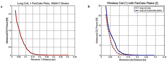 When using both electric and resonant magnetic coupling, the total received power increases by 25%, regardless of the number of transducers. If we increase the number of transducers from one to four, the collecting area is also increased by four times and the total power rises from 6 to 25 W. If we use SB1100 diodes, more electrical field and voltage is harvested; if we use 1N5817 diodes, more magnetic field and current is harvested. Another fast-rectifying diode that can harvest both the high electric and magnetic fields could be a good compromise in order to obtain more than 6 W of power per one transducer. We need to multiply the number of transducers until we reach the desired power transfer per distance ratio and enough directivity.