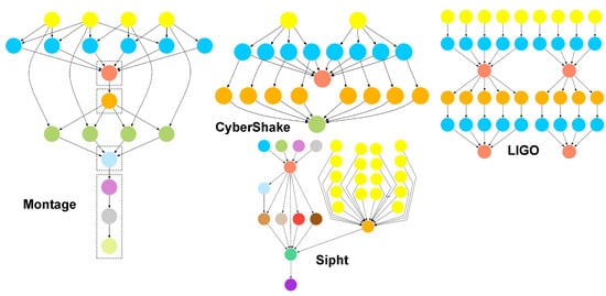 In this subsection, all experiments were evaluated with scientific workflows derived from the Montage (astronomy), CyberShake (earthquake science), LIGO (gravitational physics), and SIPHT (biology) applications, taking into account data transfers. The Montage [21] workflow is an astronomy application used to generate custom mosaics of the sky based on a set of input images. The CyberShake [22] workflow is used to characterise earthquake hazards by generating synthetic seismograms. The Laser Interferometer Gravitational Wave Observatory (LIGO) [23] workflow is used to analyse data from the coalescing of compact binary systems, such as binary neutron stars and black holes. The sRNA Identification Protocol using High-throughput Technology (SIPHT) programme [24] uses a workflow to automate the search for sRNA-encoding genes for all bacterial replicons in the National Center for Biotechnology Information (NCBI) database. Figure 4 presents the structures of the four workflows.