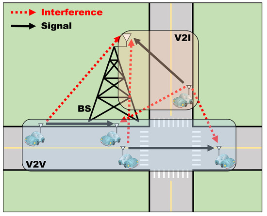 Today, with the development of autonomous driving technologies, vehicular communication technologies are receiving significant attention from both the industry and academia [1,2]. The 3GPP has recently designed a new radio (NR) sidelink to support direct vehicle-to-vehicle (V2V) communication without the help of a base station (BS) in a low-latency, high-throughput, and high-connection-density network [1,3,4]. V2V networks require ultra-reliable and low-latency communication (URLLC) services for use cases that demand certain safety features, such as autonomous driving systems that send and receive warning messages to and from nearby vehicles, even as the number of vehicles increases [5]. Therefore, it is important to manage radio resources efficiently to satisfy the quality of service (QoS) of vehicles in the V2V network.