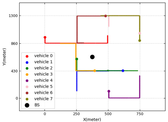 We consider a single-cell system with one base station and 20 V2I links. We follow the simulation setup for the urban case study of Manhattan with 9 blocks of 3GPP TR 36.885 [11,40]. The models of vehicle drops, mobility, and channels all follow the evaluation scenario of 3GPP TR 36.885. Vehicles are dropped on the road according to a spatial Poisson process, and the vehicle locations are updated every one time slot in the simulation. A vehicle moves at a constant speed defined in Table 1. The vehicle changes its direction at the intersection to go straight with a probability of 0.5, to turn left with a probability of 0.25, and to turn right with a probability of 0.25. Figure 4 shows the movement of vehicles for 20 s, where there are eight vehicles and one BS. The V2V channel model and V2I channel model are both described in Table 1, according to 3GPP TR 36.885. Each vehicle communicates with a vehicle nearby. We perform a time-driven simulation, where the simulation clock is advanced in increments of time slot units and the state variables are updated for every time slot. For each slot in the simulation, we calculate the CSI of the V2I and V2V links and the interference power, which results in the state of the DQN. The simulation parameters are summarized in Table 1.