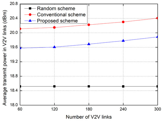 Figure 5 shows the average transmit power of V2V links according to the number of V2V links. As the number of V2V links increases, the average transmit power of vehicles increases in the proposed scheme and the conventional RL-based scheme, but the average transmit power in the random allocation scheme is fixed. Because the interference increases according to the increase in the number of V2V links, the transmit power of vehicles increases in order to overcome the interference, in the proposed scheme and the conventional RL-based scheme. The proposed scheme significantly reduces the power consumption of V2V links in comparison with the conventional RL-based scheme because of the penalty function of the transmit power in the reward. In the random allocation scheme, because the transmitter randomly selects the transmit power, the transmit power of the V2V link is fixed on average, regardless of the amount of interference caused by other V2V links. In the simulation environment of this paper, the random allocation scheme shows a low power consumption due to the low transmit power but shows an outage probability that is too high.