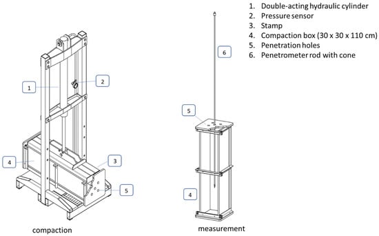 For this evaluation, a suitable test setup was laid out. The soil samples were compacted using compaction boxes (Figure 1, w = 30 cm, h = 30 cm, and l = 110 cm) and a hydraulic compactor (1) with a stamp (3). The compaction boxes were placed horizontally under a hydraulic press. Loose soil was evenly filled in 5 cm thick layers and compacted with a hydraulically loaded ram. This process was repeated 6 times before the box was closed with a clamping lid. The box was welded with thick-walled square tubes. The dimension corresponds approximately to the open side surface of the box. It can be assumed that the pressure distribution under the punch is homogeneous. The desired contact surface pressure could be set via a pressure valve.