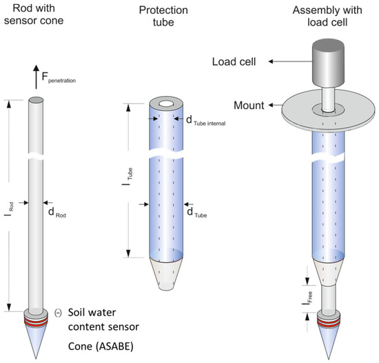 The forces of the inner part (cone and rod) were measured independently of the protection tube to exclude effects due to soil friction. The cone dimensions (diameter 10 mm and tip angle 30°) were defined according to ASABE Standard S313.3 [18]. For the inner rod, a tube was chosen to admit the passing of cables for any wiring sensors embedded in the cone tip. As proposed by Sun [11], this option is provided to implement an impedance probe for SWC measurement. With this setup with two electrodes above the cone, soil penetration resistance can be determined with respect to SWC and SD.