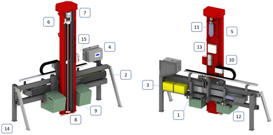 Schematic illustration of the DSP in front and rear views. 1. Tractor 3 point linkage, 2. transversal adjustment (2 m) with ball screw drive, 3. power supply, 4. control box, 5. tower with guide rails for penetrometer, 2 m down-stroke, 6. penetrometer rod with ball screw and slide, 7. load cell for tubes, 8. penetrometer tip, 9. counter balances (16 × 40 kg), 10. amplifier, 11. electrical drive for penetrometer rod, 12. electrical drive for tower movement, 13. drive controller, 14. supply pillar, 15. control panel.