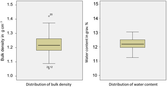 The quality of soil preparation in the compaction boxes is fundamental for the application of the DSP in field experiments. Figure 4 shows the homogeneity of bulk density and water content using box plots. The randomized sample size is 28 (7 trials and 5 repetitions).