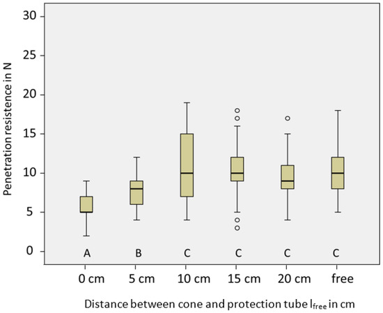 In Figure 5, the median of the penetration resistance with its scatter is displayed for all variants. The median force increased from approximately 5 N (lfree = 0 cm) to approximately 10 N (lfree = 10 cm). No significant differences were outlined for the variants “10 cm,” “15 cm,” and “20 cm” compared with the variant without the protection tube.