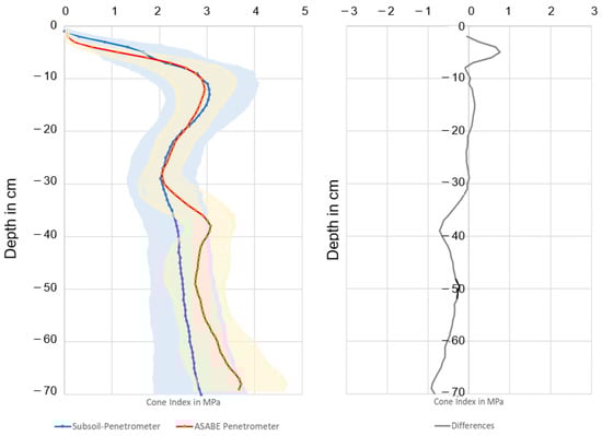 Comparison of the cone index and respective standard deviation of the SSP and a conventional penetrometer (accordant with ASABE standards) on a field (n = 240) (left), and the differences in cone index (right).