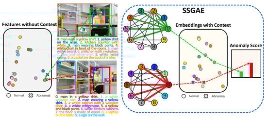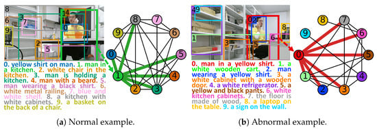 On the other hand, the latter methods explicitly combine the images or regions with their relationships as the contexts to understand and discover diverse image-level or region-level anomalies, such as video surveillance [1,2] and human monitoring [7,8,9]. Among such works, several approaches [9,15,16,27,28] consider the regions and their relations in the visual perspective for region anomaly detection, while our previous methods [7,8] additionally adopt deep-captioning models, such as DenseCap [17], to obtain region captions as the semantic information for the task. Sun et al. [27] proposed a Spatio-Temporal Graph (STG) to represent spatio-temporal relations among objects to bridge the gap between an anomaly and its context. Similarly, Ano-Graph [28] detects video anomalies by modeling spatio-temporal interactions among objects via self-supervised learning. Moreover, Spatial-Temporal Graph-based Convolutional Neural Networks (STGCNs) [13] construct a spatial similarity graph and a temporal consistency graph with a self-attention mechanism to model the correlations of video clips for video anomaly detection. Choi et al. [15] discovered out-of-context objects, i.e., objects which do not conform to the scene, by modeling all the objects in the same image via a tree-based graphical model. These works have shown the effectiveness of utilizing graphical models to represent the relationships among video clips or objects for video or region anomaly detection. To detect anomalous images in human monitoring, Dong et al. [9] employed inpainting techniques to coarsen image regions and then generate the regions by utilizing the remaining part of the image. Moreover, Semantic Anomaly Detection (SAD) [16] models the relative positions and sizes of all object pairs to detect abnormal semantic relationships between a pair of image segmentations. These methods have proven their superiority in exploring the visual information of videos and images to detect abnormal instances. However, in addition to the visual features and relations of image regions considered by these methods, region captions provide semantic information regardless of intra-object variations, which can contribute to more accurate region anomaly detection [7,8]. Our previous methods [7,8] exploit both the visual features of regions and the semantic information of region captions for the target task. Nevertheless, they consider each region separately for the anomalous single regions [7] as well as the relations of two overlapped regions for anomalous region pairs [8]. Therefore, they cannot capture the relations among more than two regions that indicate the region context, leading to failures in detecting some of the contextual anomalies in our task.