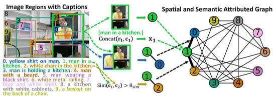 If , where is a similarity threshold, two captions and are judged to have high semantic similarity, and thus, a semantic edge is built between nodes and . Figure 3 shows an example of constructing a spatial and semantic attributed graph to model an image. The no. 1 region with its features is represented as node 1 with its attribute. The edges between nodes 1 and 0, as well as nodes 1 and 2, are built according to their spatially adjacent regions and the high semantic similarities of their captions, respectively.