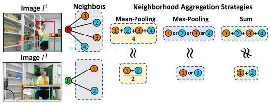 Accordingly, SSGAE is devised for detecting abnormal nodes in the proposed graph. In particular, since the regions depicting similar objects, such as a desk, and similar human behaviors, such as a man sitting on a chair, frequently appear in human monitoring, the neighbors of a node usually contain similar features in the graph. The mean-pooling or max-pooling strategy focuses on capturing the proportions of the node attributes (node attributes and node features are utilized interchangeably in this paper) or the most representative node attribute to represent the node neighbors. Therefore, existing graph auto-encoders [18,19] equipped with these strategies are difficult to discriminate such node neighbors representing the regional contexts. Consequently, SSGAE adopts the sum aggregation strategy used in Graph Isomorphism Network (GIN) [20], which is superior in discriminating such node neighbors by capturing all their attributes, as we will give the details in Section 4.2.1.