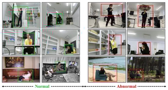 For our target task, after obtaining salient regions from images, we annotate region-level anomalies in the images, including anomalous human behaviors or irregular human-object interactions. Several examples of images containing normal and abnormal regions are shown in Figure 5.