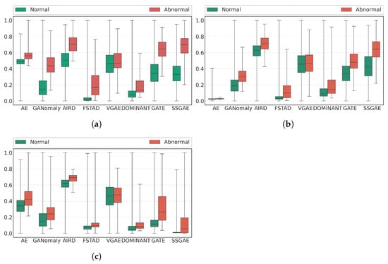 We compare our method with several traditional and popular anomaly detection algorithms, including Auto-Encoders (AE) [42] and GANomaly (https://github.com/samet-akcay/ganomaly, accessed on 16 January 2020) [36], our previous region anomaly detection methods, Anomalous Image Region Detection (AIRD) [7] and Fast-and-Slow-Thinking Anomaly Detection (FSTAD) [8], as well as three variants of graph auto-encoders, Variational Graph Auto-Encoders (https://github.com/DaehanKim/vgae_pytorch, accessed on 20 April 2021) (VGAE) [18], Deep Anomaly Detection on Attributed Networks (https://github.com/kaize0409/GCN_AnomalyDetection_pytorch, accessed on 18 March 2022) (DOMINANT) [19], and Graph Attention Auto-Encoders (GATE) [35].