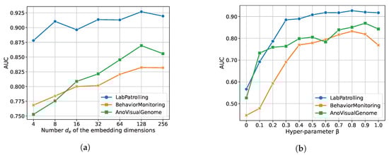 We first explore the sensitivity to dimension of the final hidden embedding by setting the values of from 4 to 256. We show the performance of SSGAE in Figure 9a. On BehavoringMonitoring and LabPatrolling, the performance steadily improves when increases from 4 and reaches the peak value of 128, and then it drops slightly when is 256. On AnoVisualGenome, the AUC score also steadily increases from to . Then the performance gain becomes smaller when . These results show that should be in an appropriate range, e.g., from 64 to 256, for the target task.