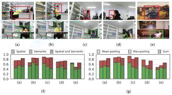 Examples of abnormal and normal regions with anomaly scores. (a–d) Examples of abnormal regions with red boxes and normal regions with green boxes in a laboratory environment. (e) Examples of an abnormal region with a red box outside a room and a normal region with a green box inside a room. (f) Anomaly scores of the abnormal regions with red color and normal regions with green color in (a–e) by the different kinds of graphs. (g) Anomaly scores of the abnormal regions with red color and normal regions with green color in (a–e) by the different aggregation strategies.