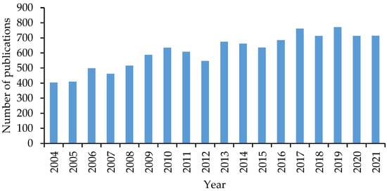 Distribution of publications on corrosion monitoring over time (2004–2021) in the SCOPUS database.