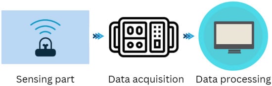Corrosion monitoring is carried out using a set of detectors, data storage and transmission systems. The implemented system analyzes the detected data and assesses the corrosion state of the structure and its components [4]. Among different types of detectors, metal coupons are one of the most widely used and reliable methods for corrosion detection in different industries. Metal coupons are exposed to corrosive conditions in order to calculate the mean corrosion rate from the mass loss, mass gain, or coulometric decrease of corrosion products. However, this technique does not provide real-time measurements, and corrosion monitoring usually relies on electronic corrosion sensors or probes [8]. These electronic corrosion sensors or probes continuously or semi-continuously transmit corrosion information to the system. Afterwards, by using the proper corrosion management algorithm in the corresponding data acquisition system, not only the performance data but also a basis for life prediction of the under-study system are provided. Therefore, continued development of these electronic devices has a high level of importance, as corrosion monitoring is one of the most essential components in corrosion prevention and corrosion control. Figure 2 illustrates the scheme of a corrosion monitoring system, and, as can be seen, it contains three main parts: (1) a sensor or probe that is connected to a corrosive area in order to measure the events and changes of the environmental parameters; (2) a data acquisition system which is used to collect and transfer the data; and (3) a data processing and storing component where the collected data are analyzed and stored.