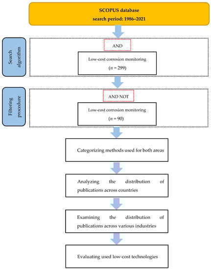 This section describes the sources of the data, the evaluation techniques, and the classifications of low-cost technologies used for corrosion monitoring. Two main fields of corrosion monitoring in the industry are associated with (1) electrochemical methods and (2) physical methods. These two fields could provide and cover a structure’s corrosion monitoring for atmospheric corrosion. Measurements made in the field are the next primary discipline of this review. This paper addresses the publications in the SCOPUS database between the years 1986 and 2021. The current review was carried out in November 2022. The initial search technique used for this systematic review paper consists of three major components. The first stage is meant to provide an initial set of articles found by employing a certain search algorithm using the Boolean operator AND (Figure 3). The obtained articles in the first stage were then filtered further in the next step in order to eliminate duplicates and irrelevant ones. Following this process 209 articles were deemed inappropriate because they lacked information on corrosion monitoring or did not clearly cover low-cost features. It shall be highlighted that in this study, the authors only considered peer-reviewed papers written in English. This exclusion was accomplished using the “AND NOT” command, and the final outcome was 38 using electrochemical methods and 52 articles implementing physical methods to track and monitor the essential parameters of corrosion across all industries.