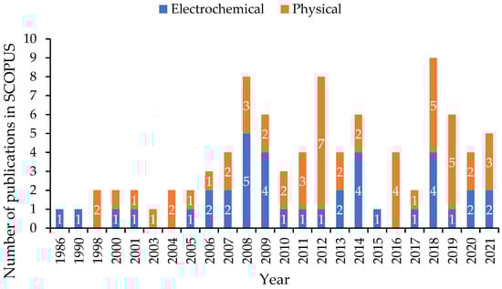 The first study found in the SCOPUS database dealing with the idea of low-cost corrosion monitoring is dated to 1984 [55]. However, this paper is not included in the statistical analysis of this research, as it only introduced the use of various types of probes with portable devices to reduce the risk and the cost of the corrosion monitoring procedure in the oil and gas industry. In fact, the actual first paper that focused on the use of a low-cost corrosion monitoring device was dated to 1986. Knuutila et al. were the first researchers to describe the use of a low-cost microcomputer compatible with electrochemical systems for polarization and cyclic voltammogram measurements [56]. Since then, the number of yearly publications on the subject was limited until 2008, when a significant increase was observed (Figure 4). A second relative rebound can be seen between 2008 and 2012. It was observed that more than 54% of all the publications over a 36-year period (1986–2021) were condensed between 2012 and 2021, highlighting the importance of technology´s growth on the development of new low-cost electronics. It can be seen from Figure 4 that the majority of the authors investigated low-cost approaches using physical methods (almost 58%), whereas only 42% of the articles introduced economic developments by employing electrochemical methods. In addition, it was observed that from 1986 until 2007, the number of papers associated with the use of electrochemical methods for corrosion monitoring was quite few (23.7%), and more than 76.3% of the articles were published in the last 14 years (from 2008 to 2021). This rebound in projects concentrating on the use of physical methods for corrosion monitoring applications occurred within the same amount of time as the number of papers that contributed more than 78.9% in the last 14 years, and only 21.1% of them were published in the years 1986 to 2007.