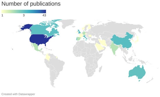 Figure 5 illustrates the number of papers by country. It an be observed that, in terms of the publication numbers, the countries that put forth the largest contribution to the use of low-cost technologies for corrosion monitoring are the United states (43 papers), the United Kingdom (7 papers), Italy and China (6 papers each), Canada (5 papers), and Australia and Portugal (3 papers each), followed by Spain, Mexico, India, and Germany (2 papers each). In total, researchers from 26 countries around the world contributed to investigating and introducing the use of new low-cost systems in different industries in order to overcome corrosion monitoring’s high price tag problem in all 90 of the reviewed publications.