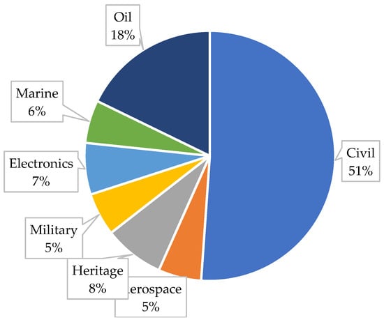 Figure 6 shows the contribution of the reviewed publications to different industries. It can be seen that 51% of the researchers devoted their studies to developing low-cost solutions for monitoring the corrosion parameters of civil structures. The second most-interesting industry for corrosion monitoring using low-cost technologies is the oil and gas industry, for which the most pipeline pathologies have occurred, and 18% of the publications implemented low-cost solutions to overcome the high price tag of conventional corrosion monitoring systems in this industry. The analysis in Figure 6 shows that the monitoring of artifacts is considered to be a vital area among researchers for developing low-cost monitoring techniques for tracking and controlling the corrosion process of these valuable assets. The rest of the industries for which researchers developed low-cost corrosion monitoring systems are shown in Figure 6.
