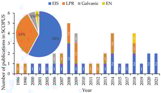 Distribution of the reviewed articles associated with the application of electrochemical methods for corrosion monitoring from 1986 to 2021.