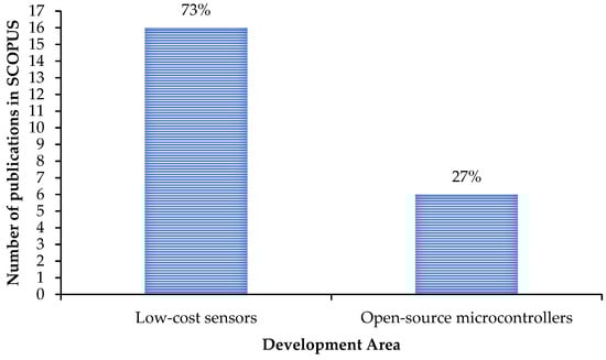 Two areas of development in the SCOPUS database on the application of low-cost corrosion monitoring solutions using the LPR technique: Area 1 focusing on the development of the sensing elements, and Area 2 focusing on the use of open-source microcontrollers as the low-cost data acquisition system.