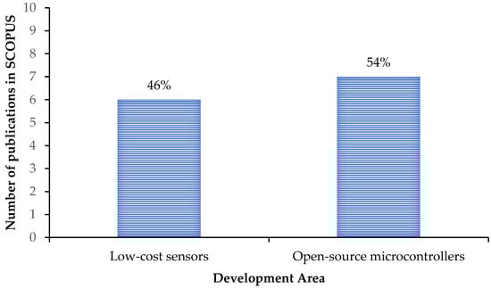 LPR is one of the most commonly used methods for corrosion monitoring in field applications. In this method, a very small polarization potential (usually ± 30 mV) above and below the corrosion potential is applied to the sample. The current response recorded over this short range near the corrosion potential is linear. As a result, the polarization resistance (RP) is defined as the slope of this current–potential curve, which is constant. Under certain conditions RP is inversely related to the instantaneous corrosion rate, according to the Stern–Geray equation [81]. In fact, polarization techniques such as EIS and LPR are considered highly accurate with easy data interpretation. Hence, many investigators have tried to develop low-cost monitoring solutions through the use of either open-source microcontrollers or developed sensing elements. In Figure 9 it is shown that 54% of the publications that implemented LPR method focused the development of their data acquisition system on using open-source microcontrollers, while 46% of the articles addressed the use of low-cost sensors.