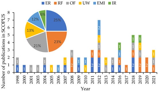 Figure 12 illustrates the rise in the number of publications associated with low-cost corrosion monitoring using physical methods that were published over the period from 1998 to 2021 and found in the SCOPUS database. It can be seen that researchers chose a more balanced distribution of physical methods suitable for low-cost corrosion monitoring applications as compared to the electrochemical approaches mentioned before. Nevertheless, among the six groups, the majority of the authors employed ER sensors and RF-based methods to detect physical changes (such as strain and thickness loss) and monitor them using inexpensive wireless technologies. These two groups contain 25% and 23% of the publications from 1998 to 2021, respectively. Analysis of Figure 12 shows that 75% of the articles focusing on the use of RF-based sensors were published in the past 10 years. At the same time, the least attention was paid to the use of IR for detecting and tracking structural pathologies. This technique has only been investigated in publications in recent years, with 100% of the articles having been published in the last 6 years. In fact, the developments in camera sensors and artificial intelligence (AI) technology in recent years have made them more accessible and thus more affordable for the development of low-cost corrosion monitoring systems [98]. Figure 12 also illustrates that the distribution of publications employing OF sensors and UW for low-cost corrosion monitoring solutions has been almost constant through across the years 1998 to 2021. However, low-cost monitoring solutions based on the EMI technique have been only reviewed by authors over a 10-year period between 2006 and 2016.