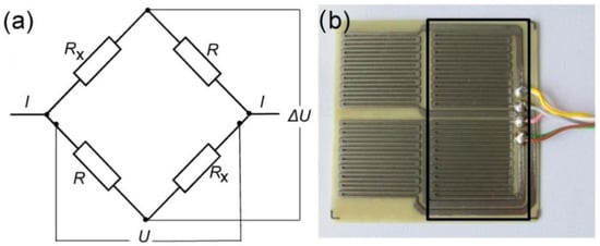 An ER sensor made of high-strength steel with four elements: (a) a schematic illustration of the sensor; (b) a photo of the sensor, protected by a transparent epoxy coating (reproduced with permission from Reference [24]).