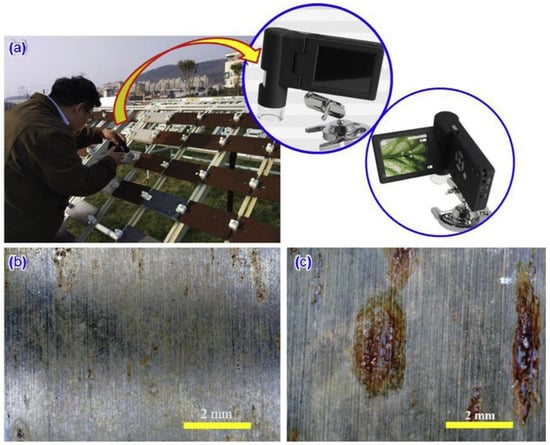 Collection of corrosion images of metallic materials in the field using a portable CCD camera: (a) image collection, (b,c) corrosion images of 304 SS exposed to a marine atmosphere (reproduced with permission from Reference [153]).