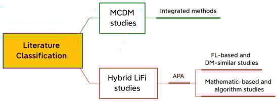 This section discusses the related works, including the related MCDM studies and all hybrid LiFi networks considered in the AP assignment, AP selection, HO management, HO skipping, and LB. Studies are divided into two categories; the first will focus on integrated MCDM studies. On the other hand, the second group of articles will consist of LiFi-related studies, and those will be divided into two parts: the first part includes all standard schemes and algorithms wherein the models and methods utilize mathematics and/or equations to reach the intended objective. The second part includes the studies of methods with the principle of the DM approach, most of which used fuzzy logic (FL) methods. Figure 2 shows the classification of the studies.