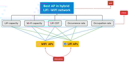For the first time in the LiFi research area, we propose an access point assignment framework using an MCDM approach including an integrated AHP–VIKOR approach. To the best of our knowledge, no similar study has presented the following aspects summarizing the contributions of this work. An MCDM problem is formulated for the presented hybrid LiFi/WiFi network.