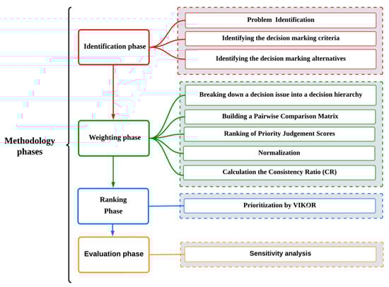 For instance, if 𝐴 is 𝑥 times as important as 𝐵, 𝐵 is 1/𝑥 times as important as 𝐴 or vice versa. The second is homogeneity. A scale with a finite range is used to illustrate the importance. Thirdly, we have dependence. Each level’s components must rely on its superiors. Expectations are the fourth and final assumption. This presumes the appropriate level fully incorporates the reasons for making decisions [29,30]. All the phases and steps of the AHP–VIKOR methodology are divided into four phases: (i) the identification phase, (ii) the weighting phase, (iii) the ranking phase, and finally (iv) the evaluation phase. All the phases and their steps are illustrated in Figure 4.