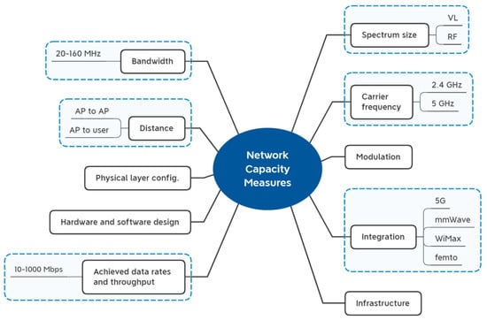 Additionally, the electrical SINR for non-negative signals, the bandwidth of the LiFi, the SINR of the LiFi connection, the PSD, the detector responsivity, the average modulated optical power, and the total gain of the LiFi channel can all be taken into account when calculating the LiFi capacity [20]. Figure 5 summarizes the factors as explained above. According to [21], the average capacity that the AP can provide to the user was formulated based on the Shannon capacity [53], as follows: