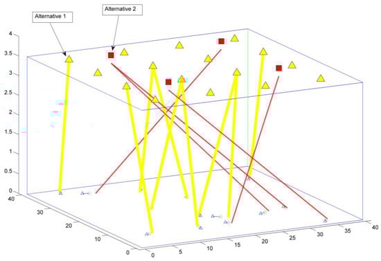 where denotes the α-type network and T is the overhead for the linked AP. It should be noted that utilizing (2) rather than (1) for network capacity estimates for the suggested approach (MCDM) may produce different results because the former focuses on an AP’s capacity inside the chosen network while the latter seeks to determine the capacity of the entire network (LiFi or WiFi).