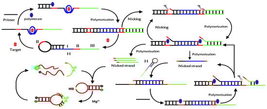- Liu, H.; Tian, T.; Zhang, Y.; Ding, L.; Yu, J.; Yan, M. Sensitive and rapid detection of microRNAs using hairpin probes-mediated exponential isothermal amplification. Biosen. Bioelectron. 2017, 89, 710–714. [Google Scholar] [CrossRef] [PubMed]