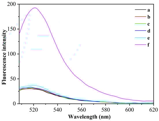 The fluorescence spectra with different sensing systems for the detection of CEA (1 pg/mL). (a) H/primer-3/MB; (b) H/primer-3/MB/CEA; (c) H/primer-3/MB/KF; (d) H/primer-3/KF/MB/CEA; (e) H/primer-3/KF/Nb.BbvCI; (f) H/primer-3/KF/Nb.BbvCI/CEA.