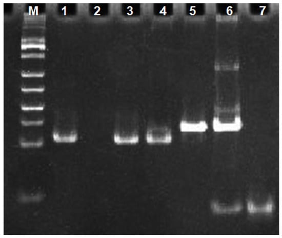 Gel electrophoresis analysis diagram. (M) DNA marker; (1) H; (2) primer-3; (3) primer-3/H; (4) H/primer-3/KF/Nb.BbvCI; (5) H/primer-3/KF/CEA (20 ng/mL); (6) H/primer-3/KF/Nb.BbvCI/CEA (20 ng/mL); (7) DNA-1.
