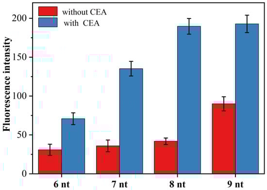 Effect of primer chain length on the fluorescence intensity of CEA (1.0 pg/mL) assay, (6 nt: primer-1; 7 nt: primer-2; 8 nt: primer-3; 9 nt: primer-4).