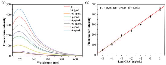 For investigating the sensitivity of the fluorescence aptamer sensor study based on isothermal exponential amplification reaction and DNAzyme for CEA detection, the relationship between the concentration of CEA and fluorescence intensity was examined by measuring the fluorescence intensity of the sensor after reacting with different concentrations of CEA. The experimental results are shown in Figure 6a. As the concentration of CEA increased, the fluorescence signal of the sensing system was gradually enhanced. This is because the CEA concentration increases, the exponential amplification reaction increases, producing more DNAzyme sequences, which in turn cleaves more MB substrates, and thus the fluorescence signal was stronger. When the linear regression analysis was performed on the logarithmic values of fluorescence intensity values (520 nm) and CEA concentration of the sensing system, a good linear relationship was found for CEA concentration in the range of 10 fg/mL to 10 ng/mL (Figure 6b) with a linear equation: FL = 66.854 lgC + 378.85 (R2 = 0.9965) and a detection limit of 5.2 fg/mL for CEA. The results indicate that the proposed sensor can be used for the CEA protein sensitive detection.