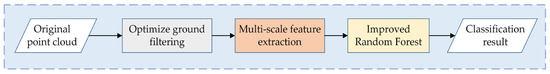The proposed classification method mainly consists of three main steps, as shown in Figure 1: (1) Extracting ground points from the point cloud using the progressive TIN densification filtering and calculating normalized elevation of the point cloud with the ground points; (2) Construct the multi-scale geometric features of point clouds; (3) Classify the point cloud with the improved Random Forest algorithm.