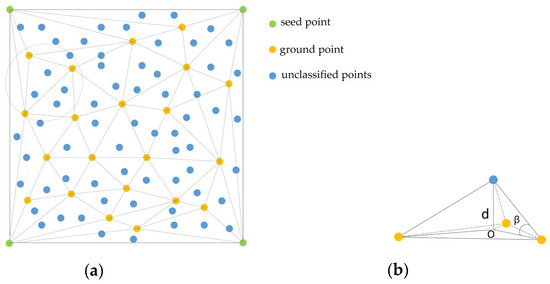 After denoising, the ground points are extracted by using progressive TIN densification filtering [32] and the basic idea is described as follows: (1) The point cloud is divided into a grid according to the maximum building size in the scene. (2) The lowest point in the grid is selected as the ground seed point, the other ground points are iteratively added by using the progressive TIN densification filtering and the iteration terminates when no other points are added to the TIN. The schematic diagram of the densified TIN is shown in Figure 3a. Figure 3b shows the densification process of a triangle of three ground points. In Figure 3b, the unclassified points are identified as ground points when iterative d and iterative β are less than the corresponding threshold.