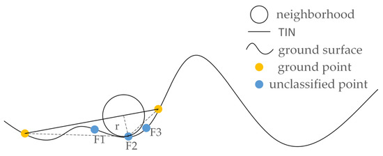 As some ground points may be lower than the plane of an identified ground triangle, the progressive TIN densification filtering may omit these ground points. In this paper, for a point in a triangle area, if its distance to the triangle is less than a pre-set threshold r, it is identified as a ground point, as shown in Figure 4. The extracted ground point clouds are used to generate a digital elevation model (DEM) by interpolation, then the other part of the point cloud (non-ground point) is normalized according to the DEM, to obtain the elevation features of the point clouds, which could help eliminate the influence of terrain undulation on the classification.
