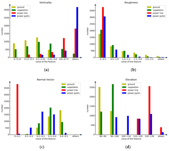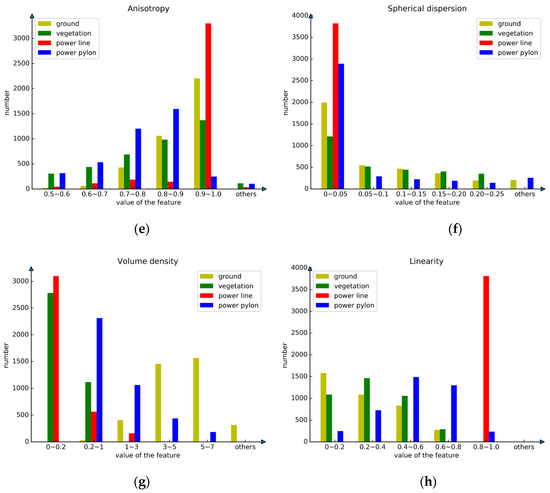 The study area in this paper is a high-voltage transmission corridor located in a mountainous region. The category of ground objects in this region is relatively simple, but the distribution of ground objects varies greatly. The comparison of different ground features is shown in Figure 9, which shows that features such as verticality, normalized elevation, spherical dispersion, roughness, normal vector, anisotropy, linearity and volume density have different performances on different ground objects. The power lines in the transmission corridor have distinct linearity, elevation and normal vector. Verticality plays an important role in the classification of power pylons.